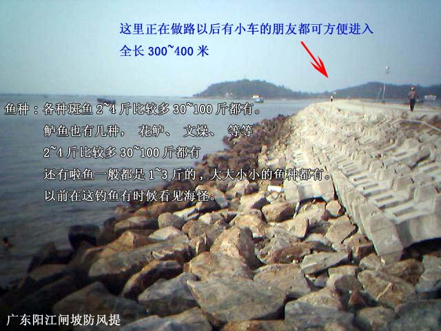 有朋友问,闸坡钓点具体如何走?自己开车来的话,买张广东省地图就可以来得到。走高速看路牌往阳江走,走到阳江,再看路牌往闸坡走。入了隧道后没有路牌指标怎样走到防风提了,自己找的话向西北方走去.转左转右具体很难讲,最好方法,找个开摩托车的搭客佬叫他带你去,本地人说那叫<<州仔>>,也可讲去〈渔排〉,到了那你会发现很多钓点,其中防风提是最长的钓点,在西北方向,东南方向也有钓,东南方向是马尾岛也是个很好的钓点,路已经做好了。