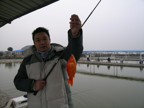由于是混养的,中鱼后就直接飞鱼上岸了。看着红色大鲫我笑称:看来自己的台钓竞技手艺还未丢 ~~ ~~ 呵呵!!!自我夸奖一下。