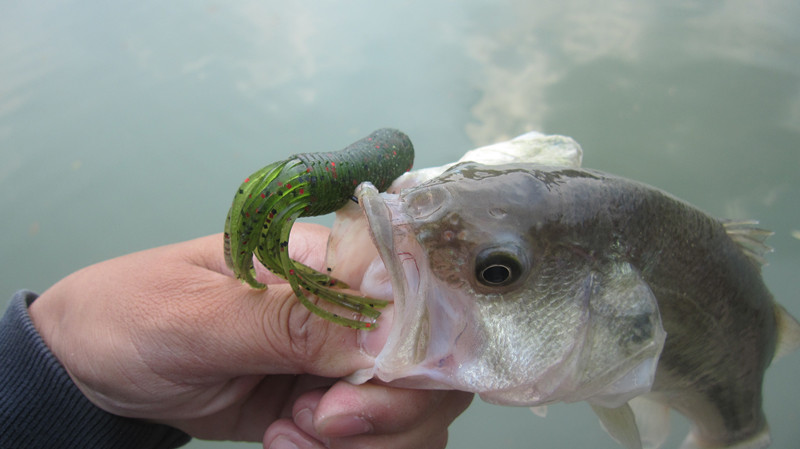 我到基地时皇旗兄弟已经在钓了,说现在的鱼比以前难钓了,不过晴转多云的天气不错,习惯性的先钓西北角再钓西南边。不知是被皇兄的话唬住了还是咋滴,必上鱼的西北角居然没有碰到咬口。快速到达西南边开始用DEK钓组用一条破旧不堪的OSP DoliveCrawler 面条虫+FINA 1# wacky钩(F306)+0.5g的插铅,上次的经验换了种挂饵方法果然起了效果,上了两条鱼虫子才彻底坏掉。