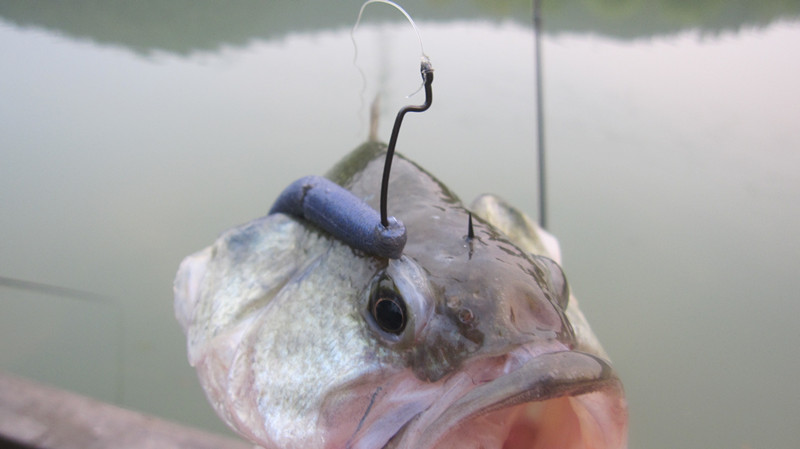 在我们座位下面是一个平台,平时是个聚鱼的地方,吃的差不多了在吹牛,我就去抛了一杆,水漂进入平台,走线中鱼了,大家都坐不住了!钓鱼人怎么都这么冲动呢?嘿嘿,路亚走起。下午我开始用小面条玩德州钓组,搜钓近岸水域,很快就钓了3条小鱼。然而接下来是将近1个半小时的真空时间——没有钓到鱼,钓的都快没信心了! 后来大家都选择在一些水草区域磨鱼,我发现居然没人在钓栈桥下面!栈桥下面很丰富,有石块和杂草,但是大概只有20到30公分的深度,栈桥的平台大概宽度1米,岂不是绝妙的标点?先找了一个楼梯角落,这也是空间最高一处了,其他地方都是十几公分的高度,4寸SENKO德州钓组,水漂进去,立马一口,ML的杆子硬生生的拽出那个三角形的空间!鱼的体型非常不错!信心来了,接着打水漂搜索其他地方,接着我的饵进入下面后,跳动着快到平台外面了,就在口子上,看到一条鱼跟着饵过来,我停止动作等等轻轻一抖,口来了又一条漂亮的BASS,期间有一条鱼我来回来次都有咬我的饵,不过都没拉出来。最后准备钓收杆鱼了,还去逗那条鱼,哈哈真的还咬,这次中鱼了,在栈桥下面坚持了一会,上岸时我惊住了:钩子从眼睛上面打进去钩尖从头盖骨出来。不知道此鱼会不会有事。收杆走人。