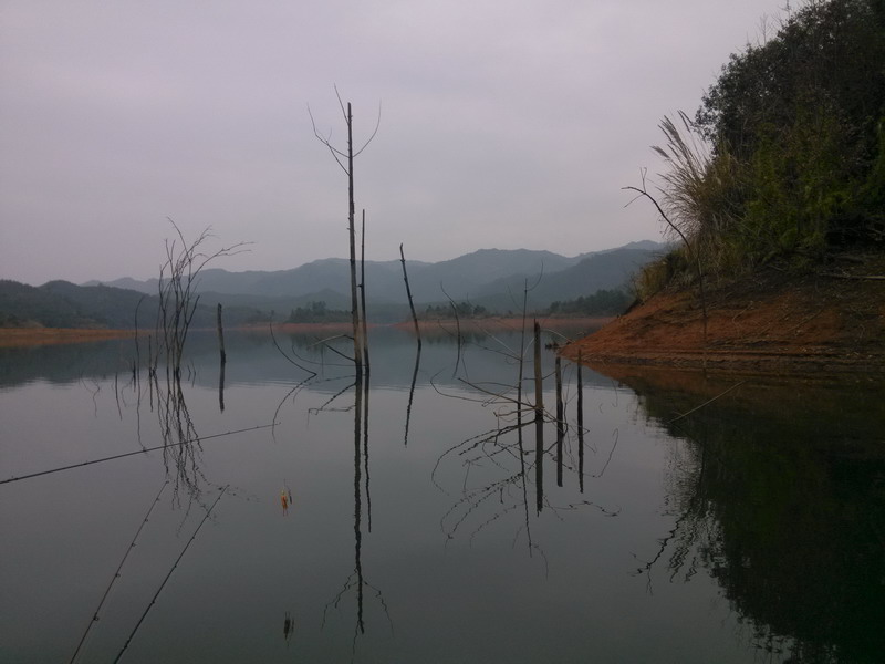 将近中午到达钓场,这是九几年才建起的一个水库,库区风景旖旎,蓄水淹埋了无数树木,众多标点令我们兴奋不已,野猪更是在第一个停留的标点中鱼,可惜这也是他 今天唯一的一尾鱼,哈哈,接下来是和我小明的表演时间!