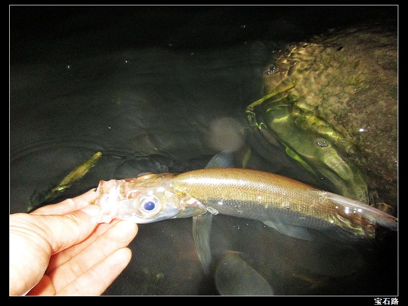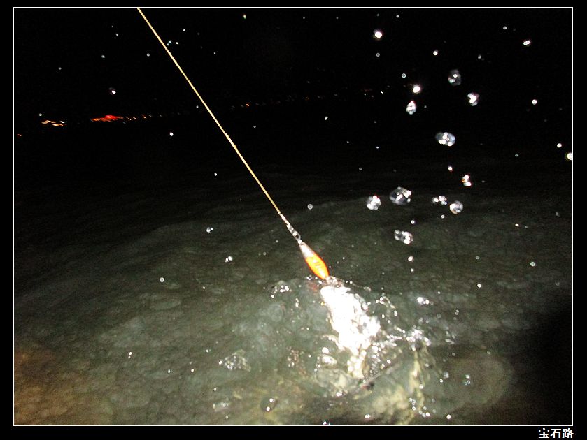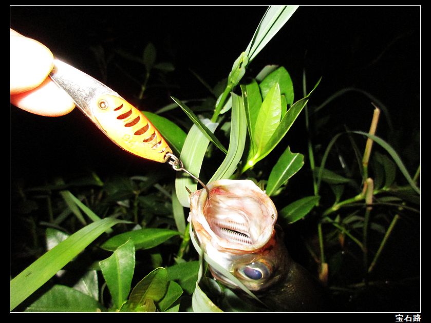 今天晚上还是一贯坚持出钓,每天两小时基本雷打不变。天天都是走钓,只是今天来到一个原先来的比较少的一个点,此点平时不怎么出鱼,原先水底下有一个暗出水口。离岸也很近,每当下雨之后,此点便有大量的雨水通过暗出水口涌出。出水口周围全是乱石,有乱石的地方自然会有虾米之类的藏身在乱石之中。到此点后,本来是挂15克水蛭远投作钓,但有一杆饵收到岸边快出水时受到攻击。不过没中,猜想鱼个体不大,我立马换上女妖亮片直接近投作钓。几杆之后又是一个重口,还是没中,明白了!手法再慢点,马上就来。第一条翘嘴——