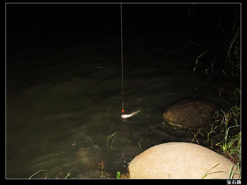 第三条右移站立点二十米之后,直接在岸边的石头下咬中,又是直接飞起上岸——